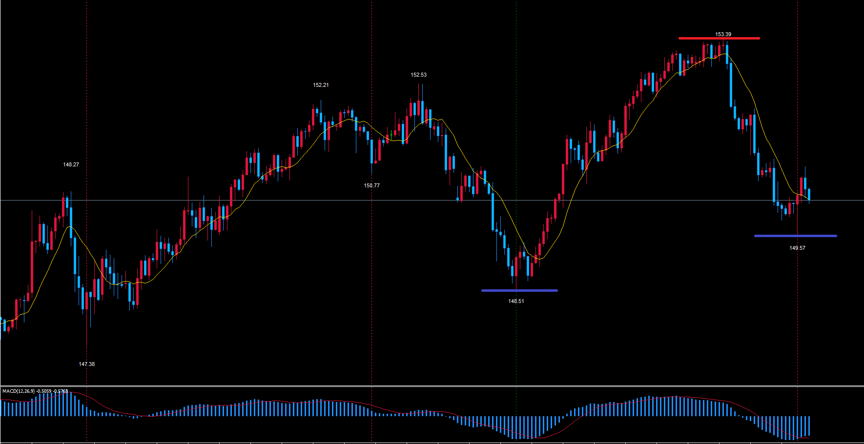 現在の起点149.57からの4時間サイクルは153.39以下で天井を付け、149.57以下で底を付ける
