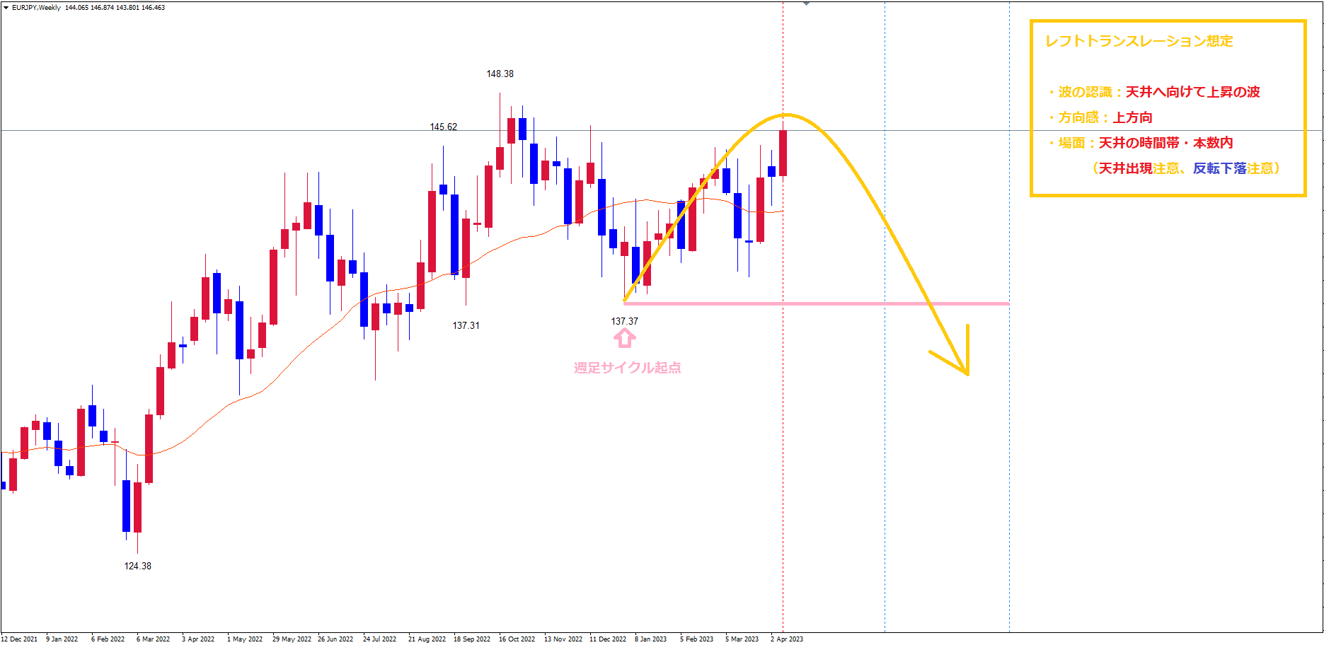起点の桃のラインからの週足サイクルは、レフトトランスレーションのサイクルを想定しています。