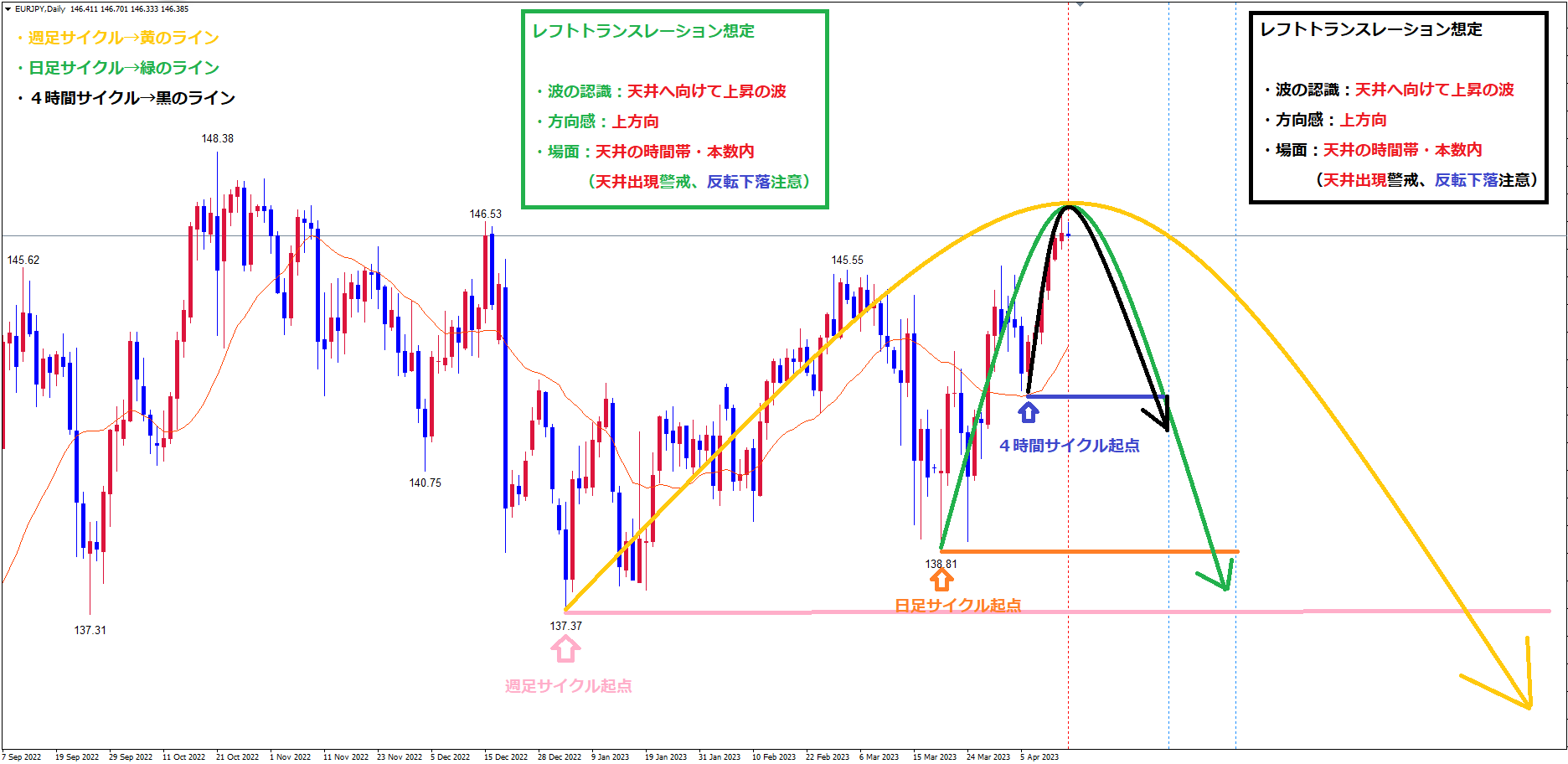起点のオレンジのラインからの日足サイクルは、レフトトランスレーションのサイクルを想定しています。