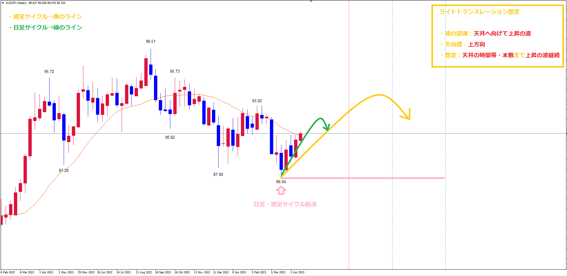 豪ドル円の週足サイクルもライトトランスレーションを想定しておきます。