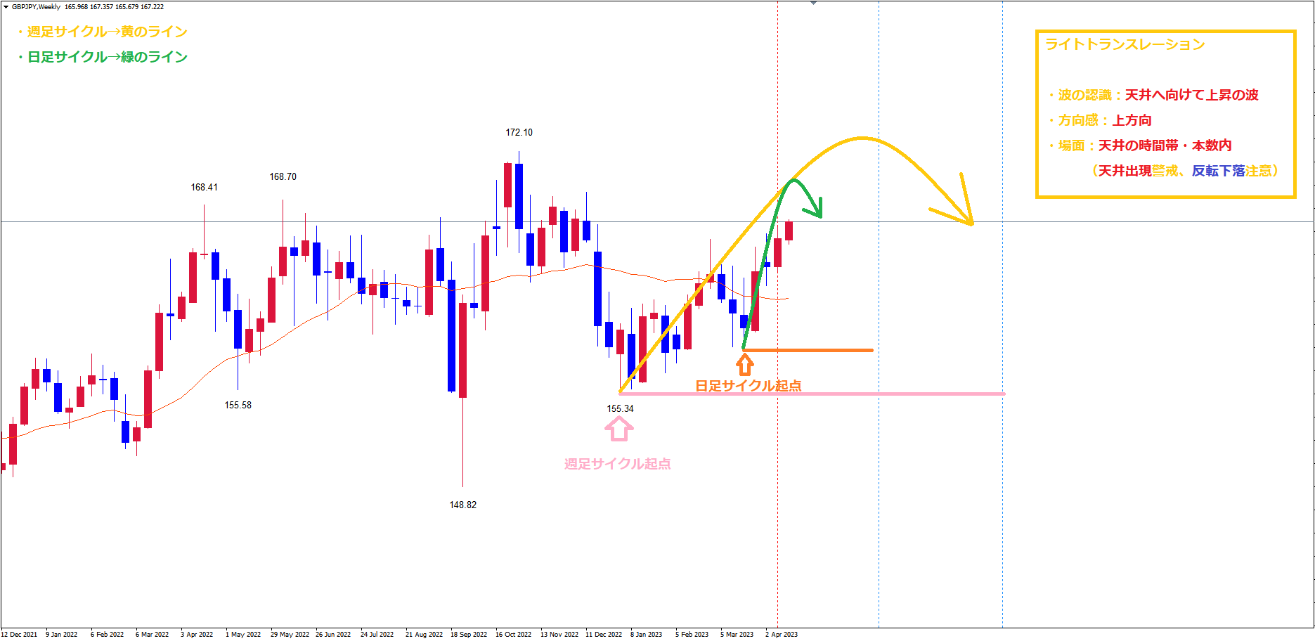 ポンド円の週足サイクルもライトトランスレーションを想定しておきます。