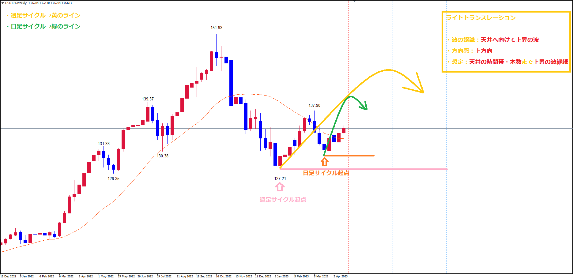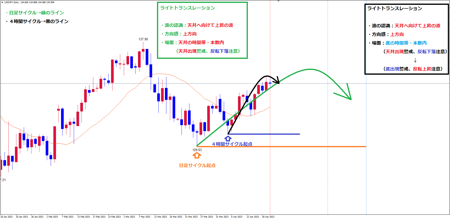 起点オレンジのラインからの日足サイクルは、ライトトランスレーションのサイクルを想定しています。