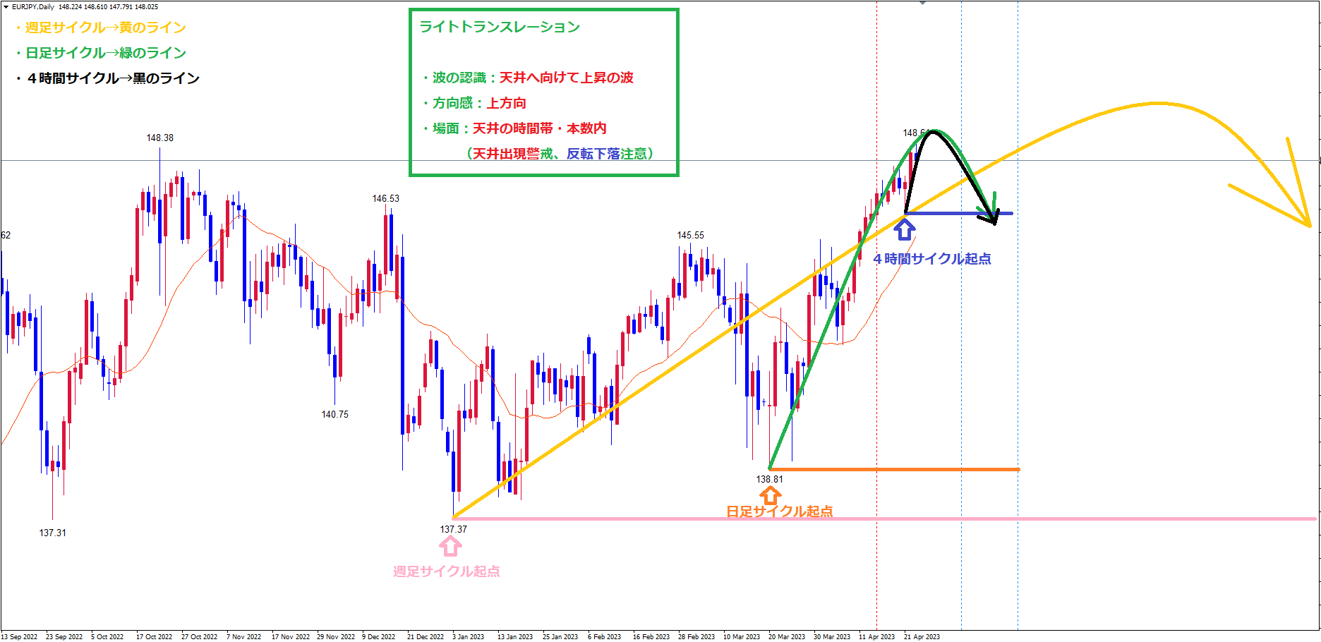 起点オレンジのラインからの日足サイクルは、ライトトランスレーションのサイクルを想定していきたいと思います。