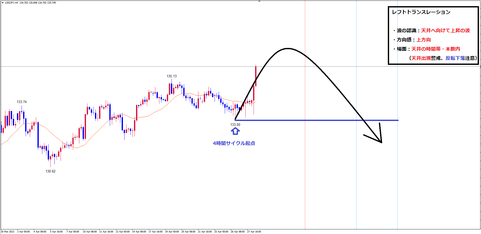 上記2点の情報から、ドル円の起点青のラインからの4時間サイクルも、レフトトランスレーションを想定しておきたいと思います。