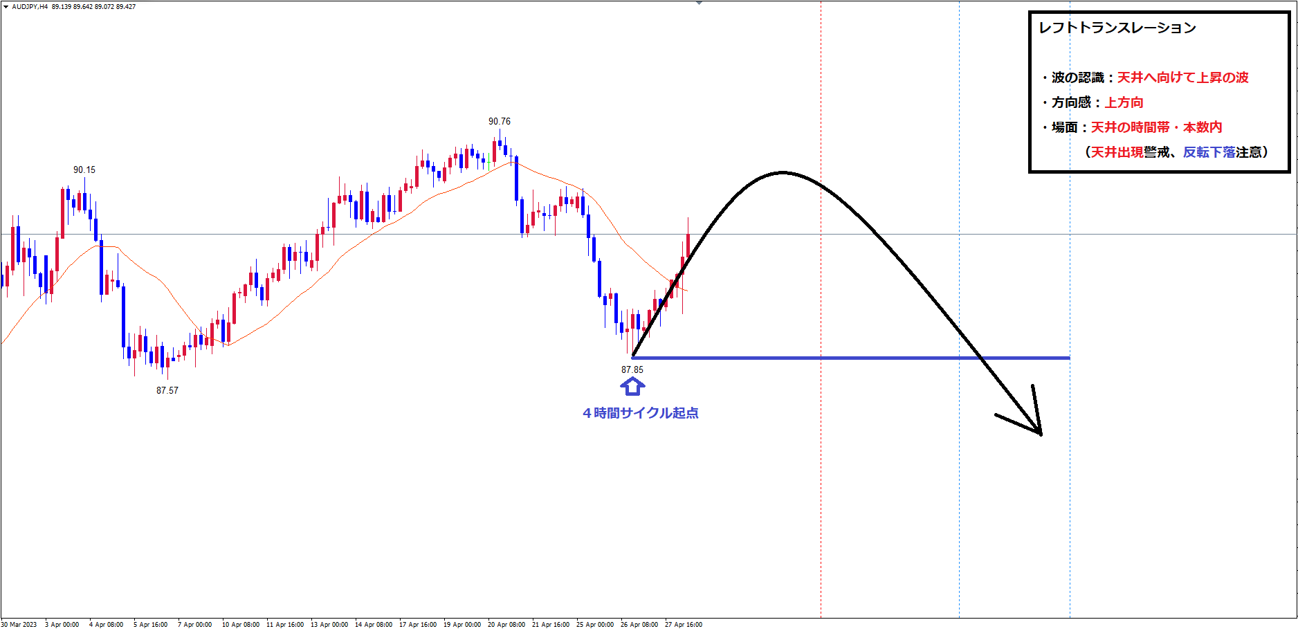 そして、NZドル円の前回の4時間サイクルがレフトトランスレーションのサイクルを形成し、