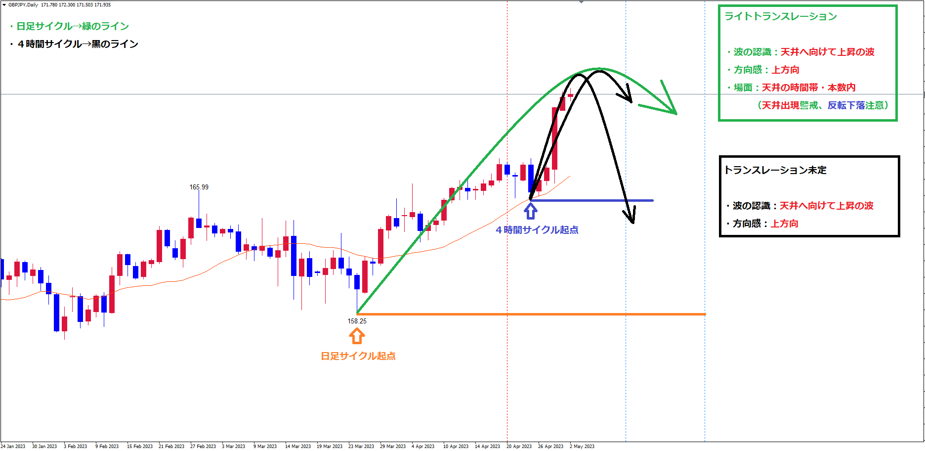 起点オレンジのラインからの日足サイクルは、ライトトランスレーションのサイクルを想定しています。