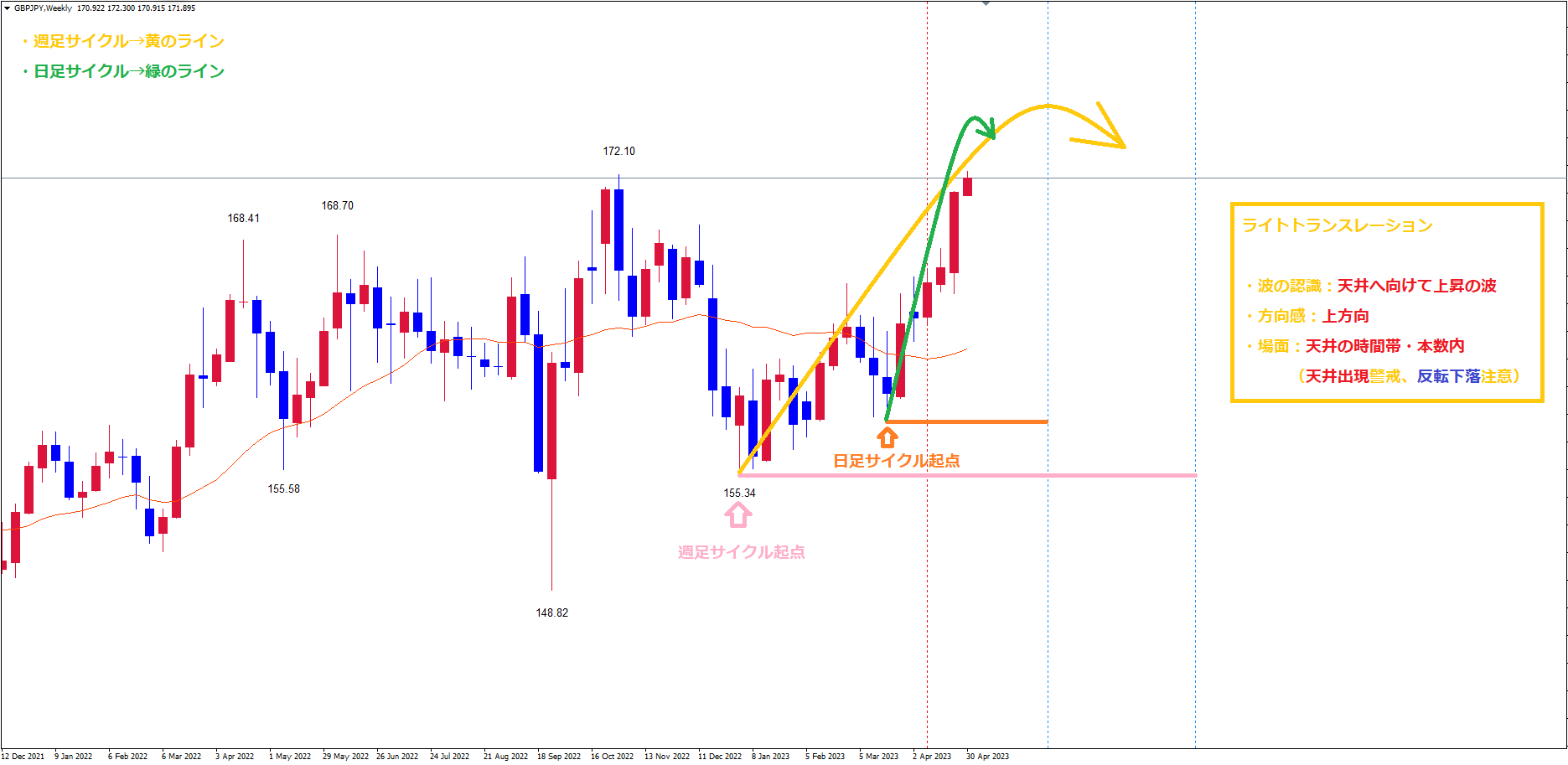 起点桃のラインからの週足サイクルは、ライトトランスレーションのサイクルを想定しています。