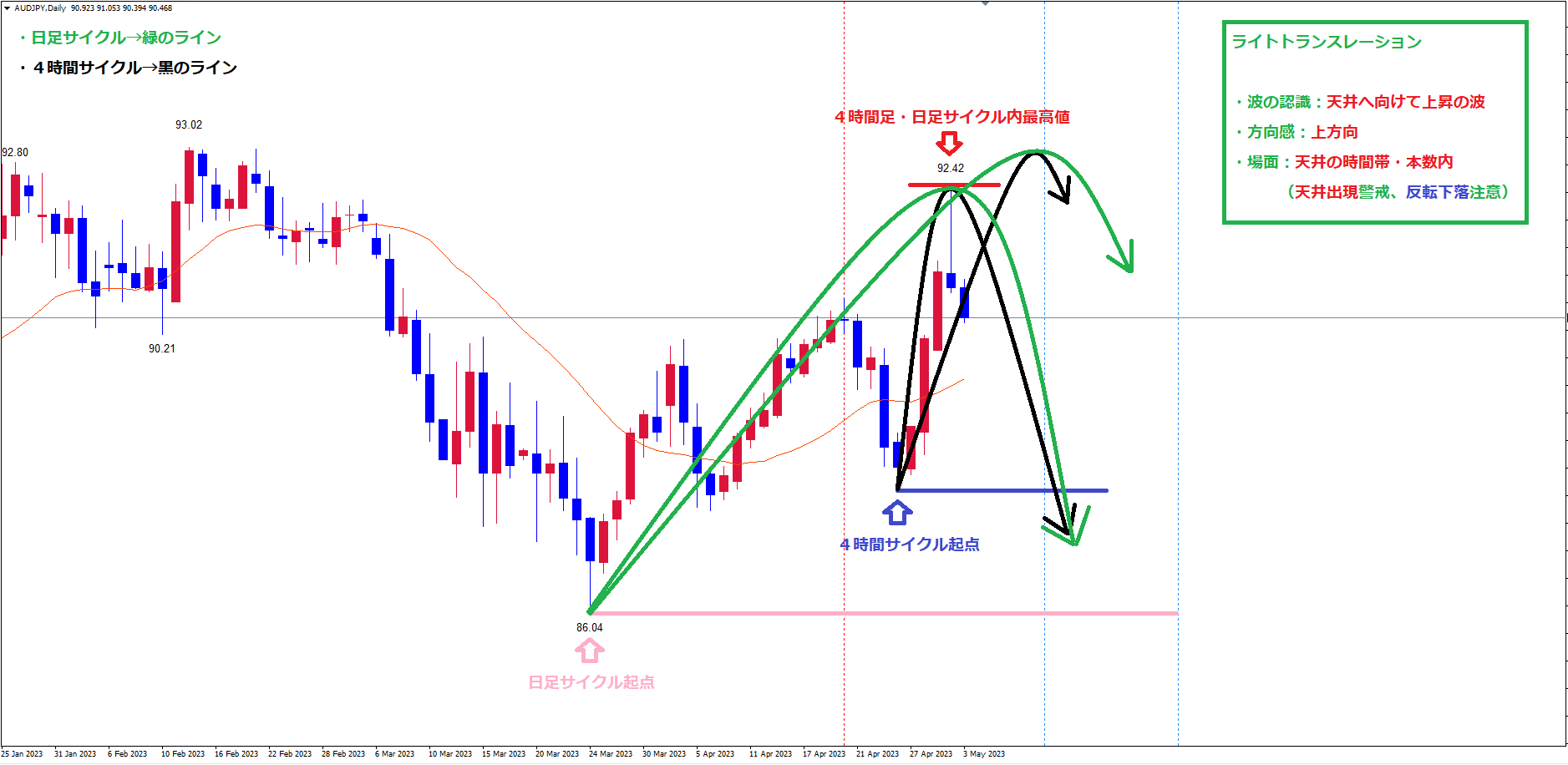 ライトトランスレーションの日足サイクル天井のパターンとしては、今回の4時間サイクル天井 = 日足サイクル天井 というイメージで、