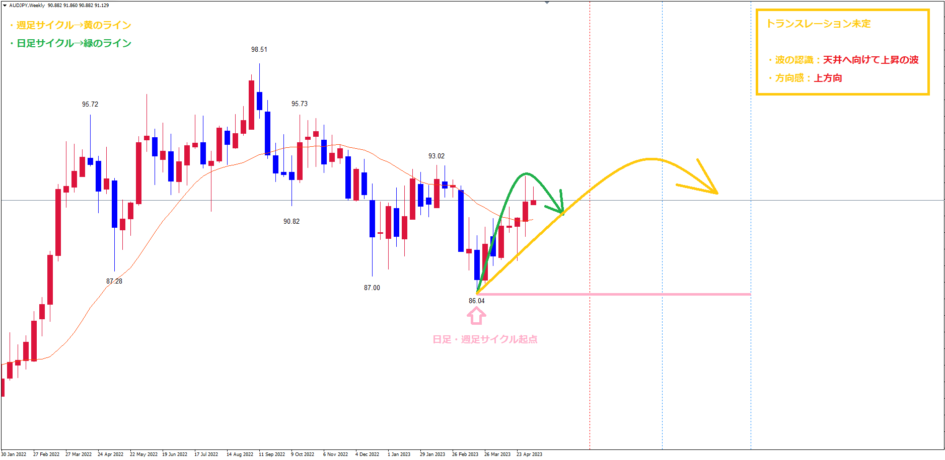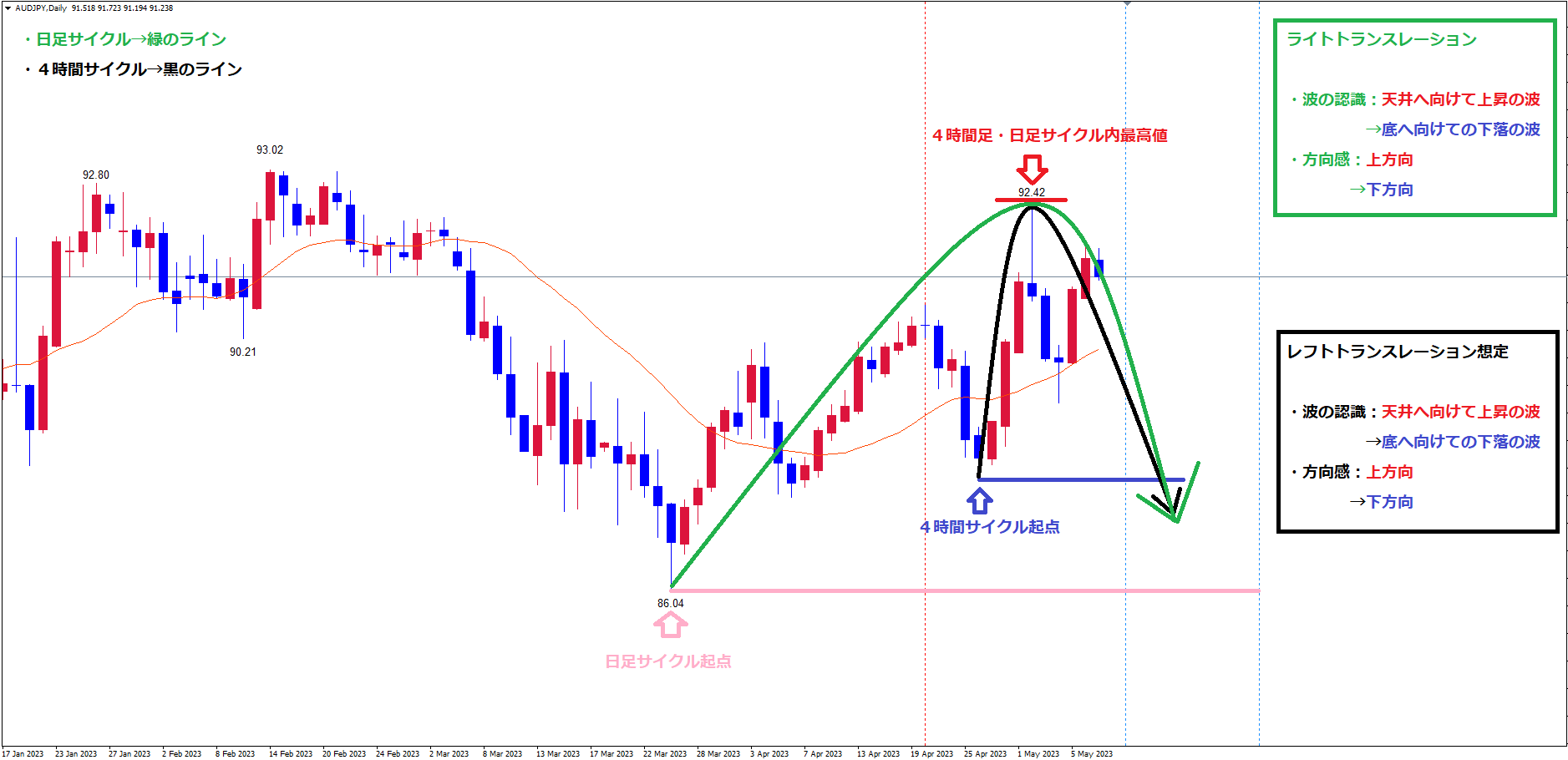 現状では中央より右側で5/2に最高値92.42赤のラインを付けているのでライトトランスレーションのサイクルを想定しています。