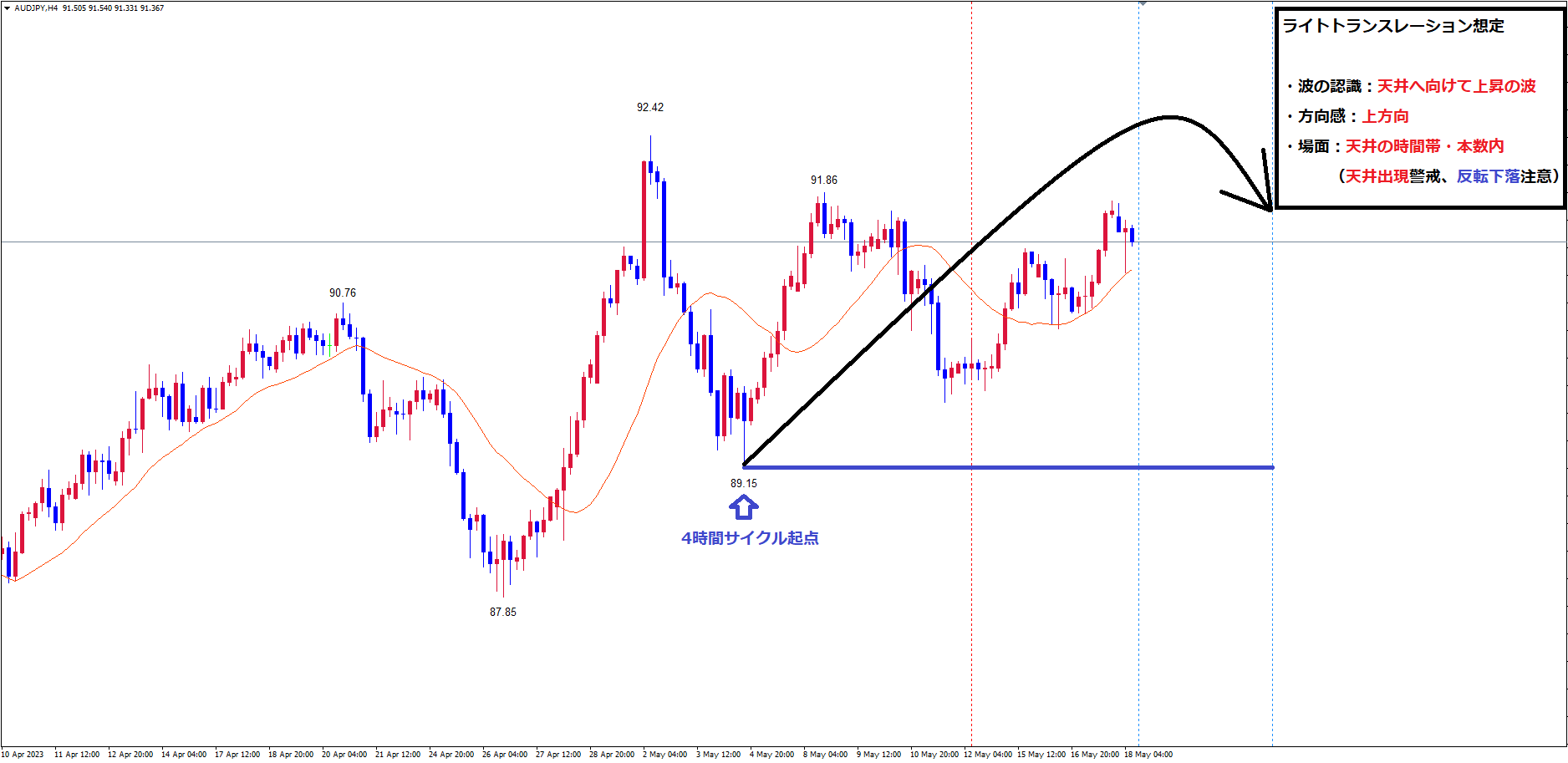 なので、基本的に豪ドル円の4時間サイクルもライトトランスレーションのサイクルで、