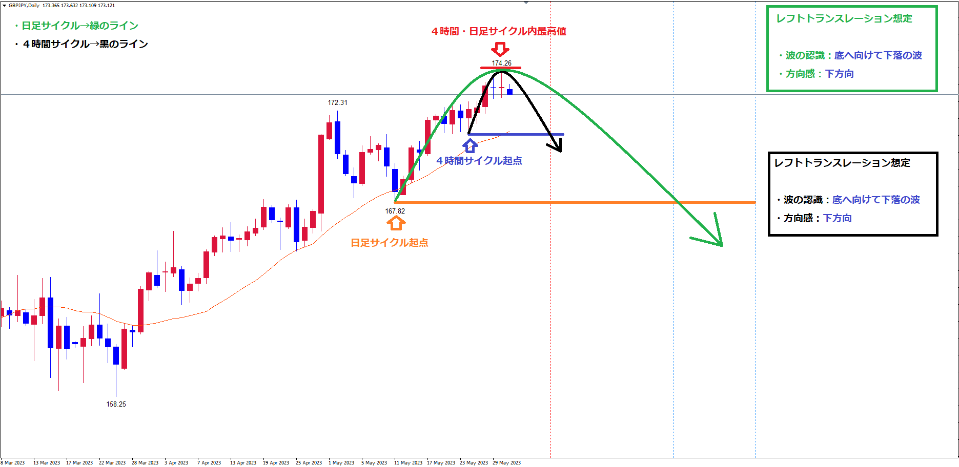 そして、赤のラインは中央より左側で付けている最高値なので、日足サイクルはレフトトランスレーションのサイクルを形成する事が考えられます。