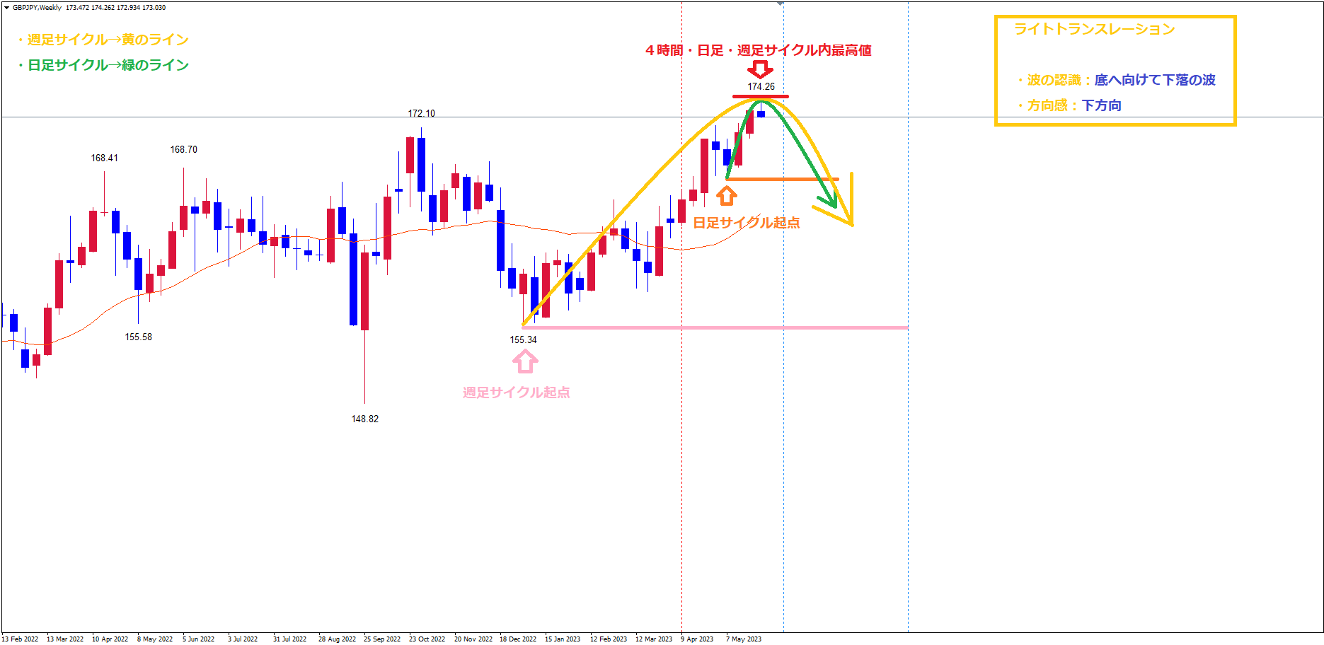 このサイクルは中央より右側で最高値を付けている事で、ライトトランスレーションのサイクルを想定しています。
