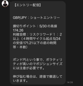 LINEのお友達にはお伝えしましたが、短期移動平均線を実体で下抜けしたタイミングで、ポンド円でショート保有しました。