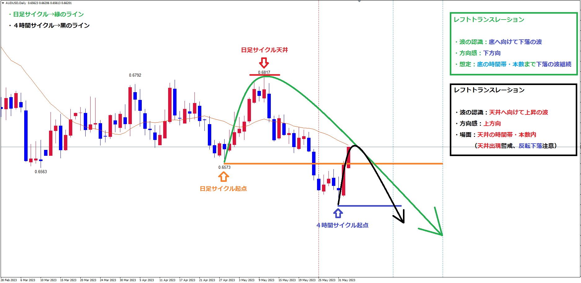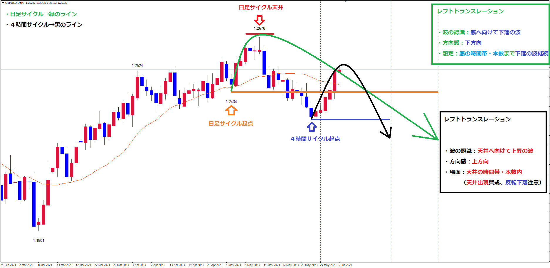 逆に今回の4時間サイクルがライトトランスレーションのサイクルを形成する場合、日足サイクルはイレギュラーで青のラインでスタートしている形で見ていきます。