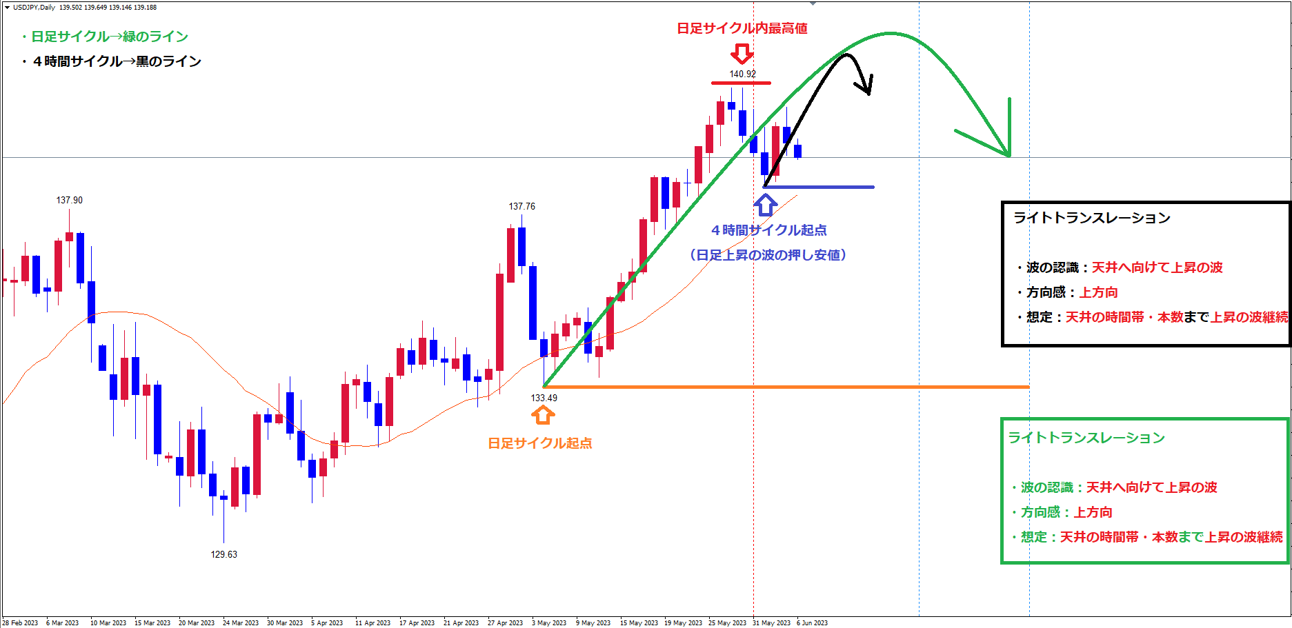 日足サイクルもレフトトランスレーションのサイクルで、直近の最高値赤のライン(5/30の高値140.92)で天井を付け、