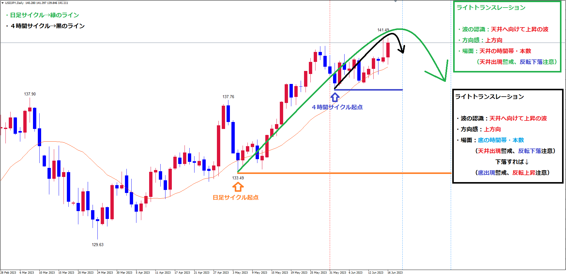 このサイクルは中央より右側で最高値を付けている事で、ライトトランスレーションのサイクルを想定しています。