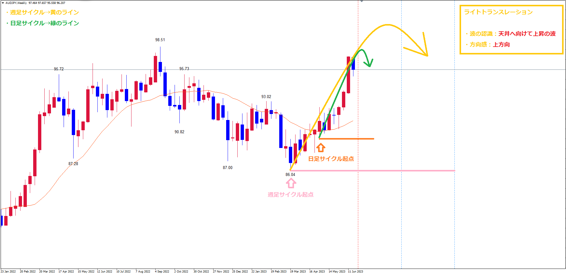 今回は豪ドル円の日足・週足のサイクル的認識とパターン&イメージがどうなるかについて解説していきます。