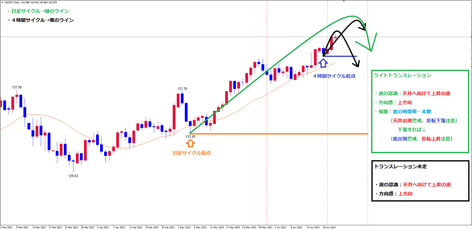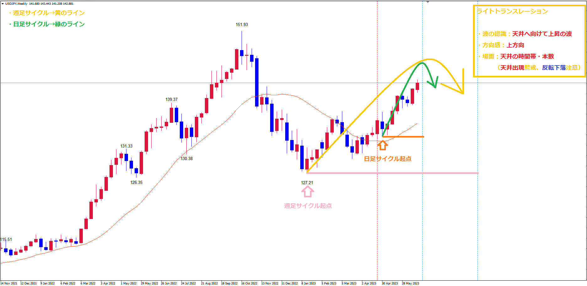 このサイクルは中央より右側で最高値を付けている事で、ライトトランスレーションのサイクルを想定しています。