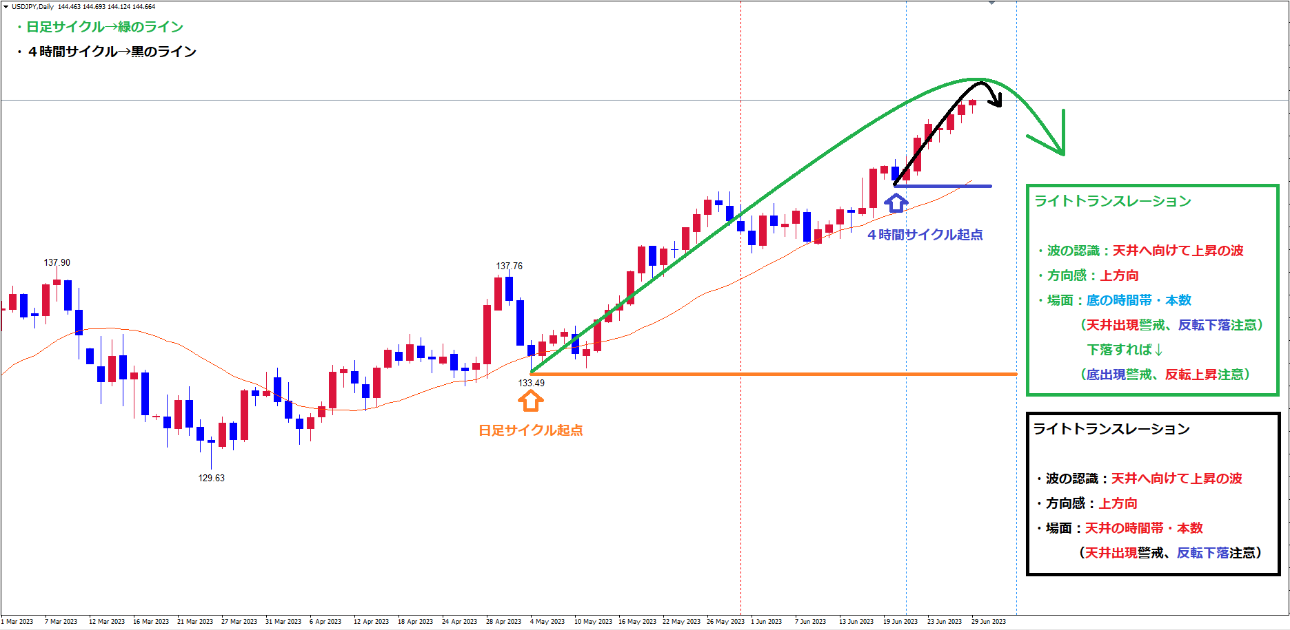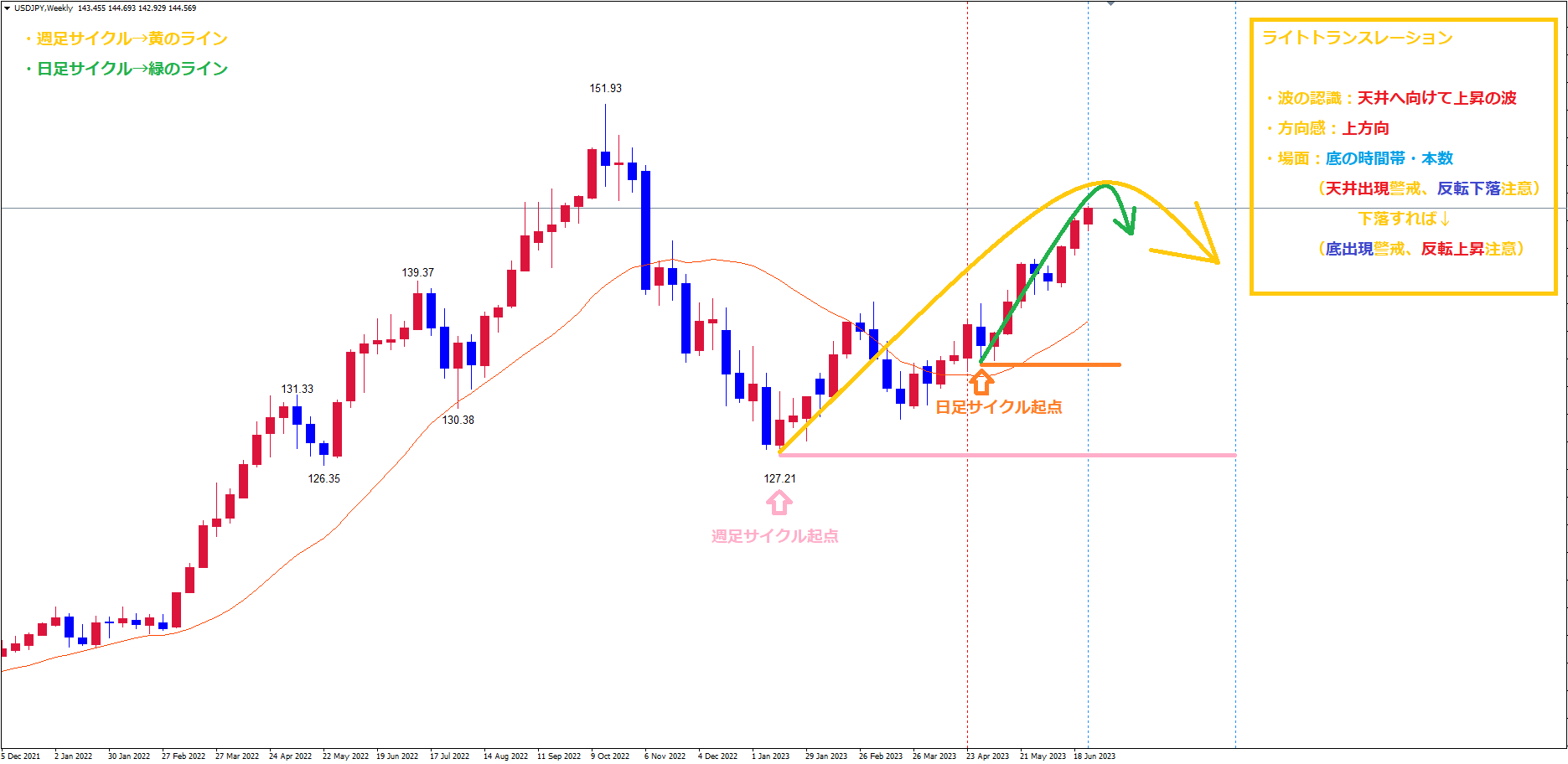 このサイクルは中央より右側で最高値を付けている事で、ライトトランスレーションのサイクルを想定しています。