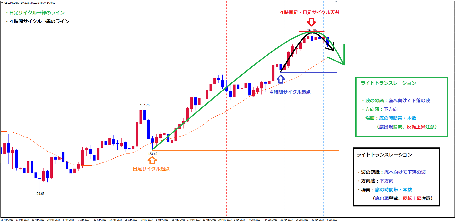 先程解説した様に、日足サイクルは赤のライン(6/30の高値145.06)で天井を付けていると見て、