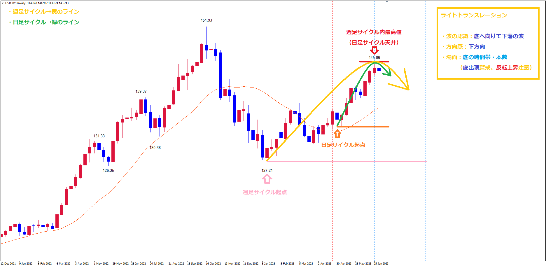 このサイクルは中央より右側で最高値を付けている事で、ライトトランスレーションのサイクルを想定しています。