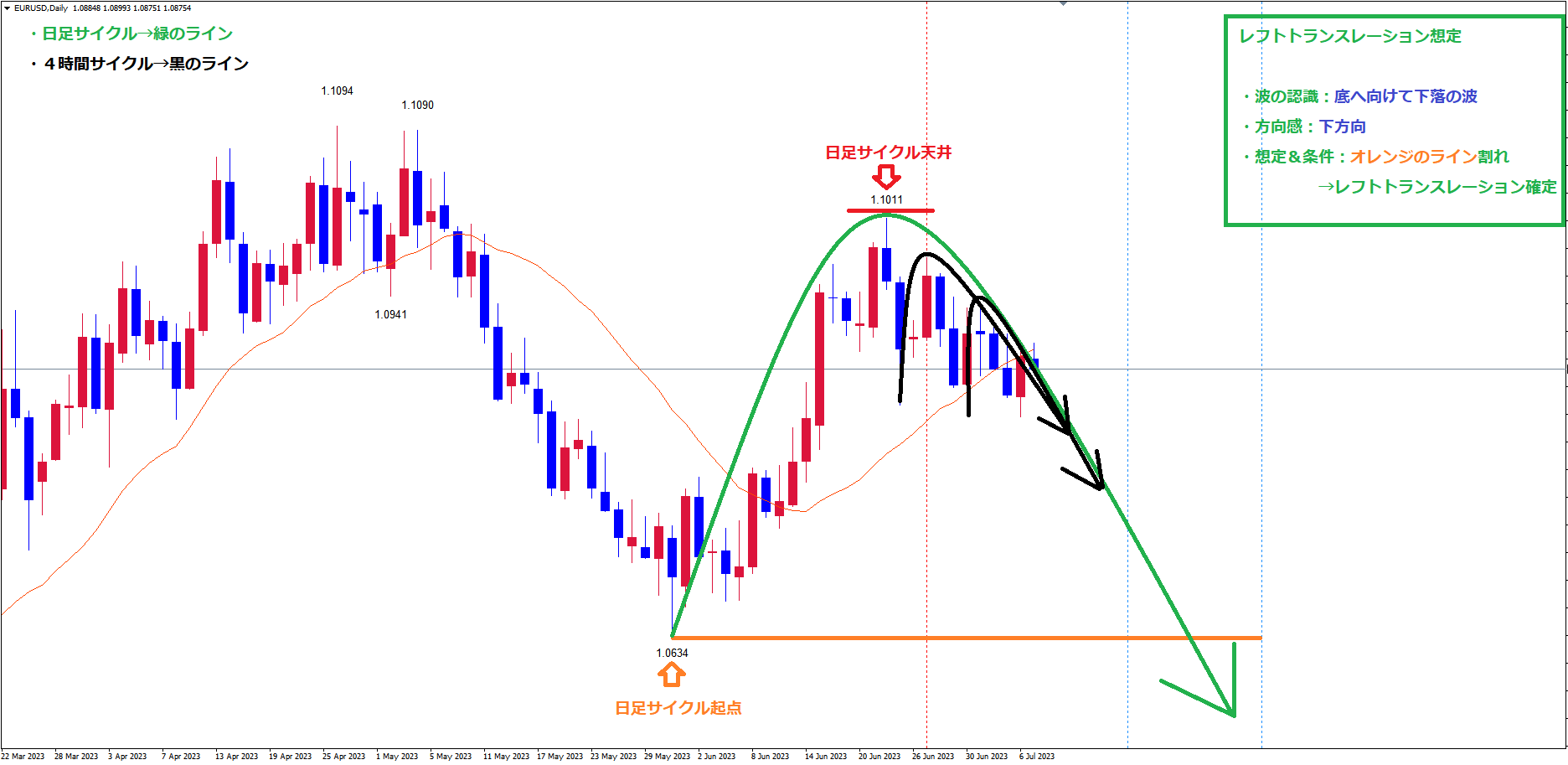 また、オレンジのラインを割れてくればレフトトランスレーションのサイクルという事が理論的に確定するので、今後の注目ポイントとして見ていきましょう。