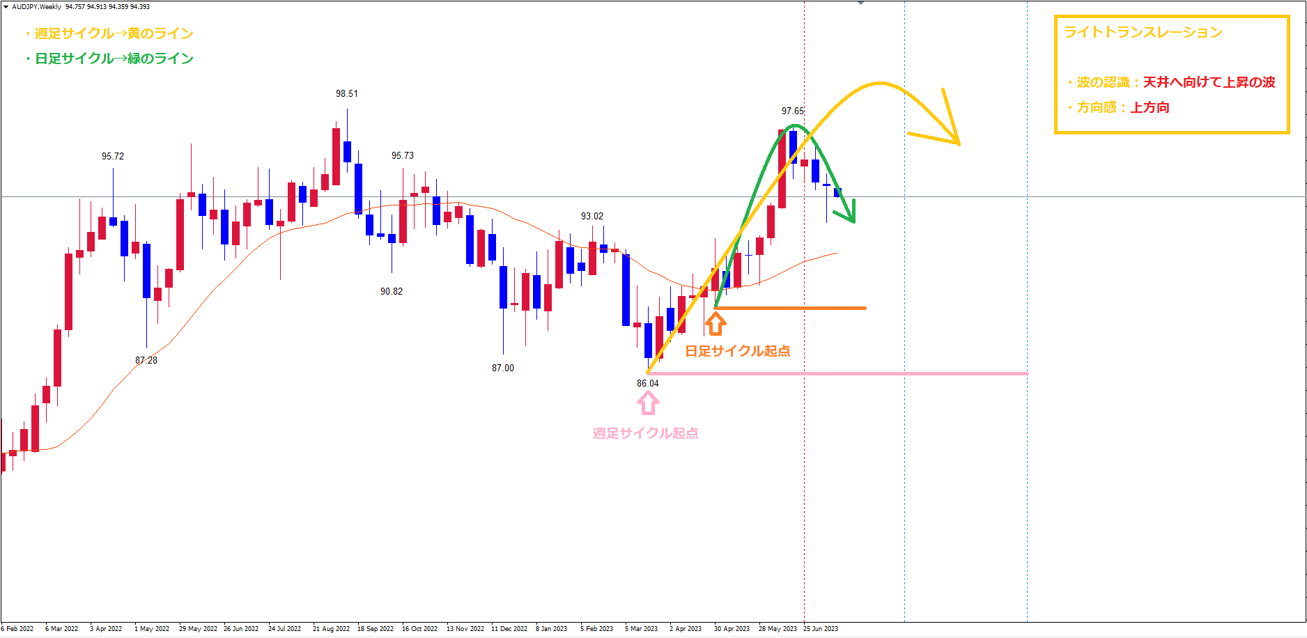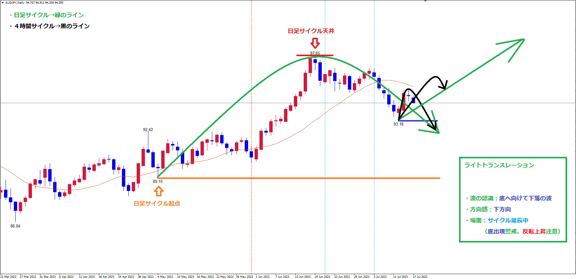 日足サイクルは現在、最高値赤のライン(6/19の高値97.65)で天井を付け、底へ向けて下落の波、方向感:下方向 という認識です。
