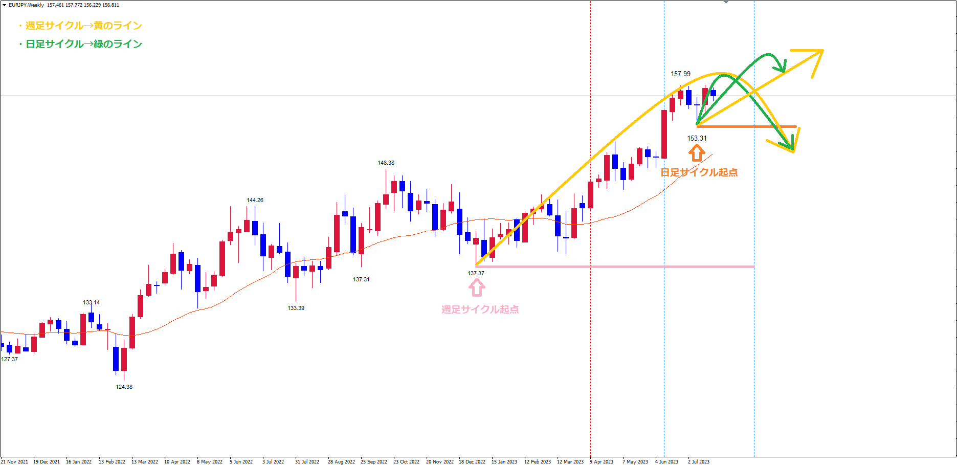 今回はユーロ円の日足・週足のサイクル的認識とパターン&イメージがどうなるかについて解説していきます。