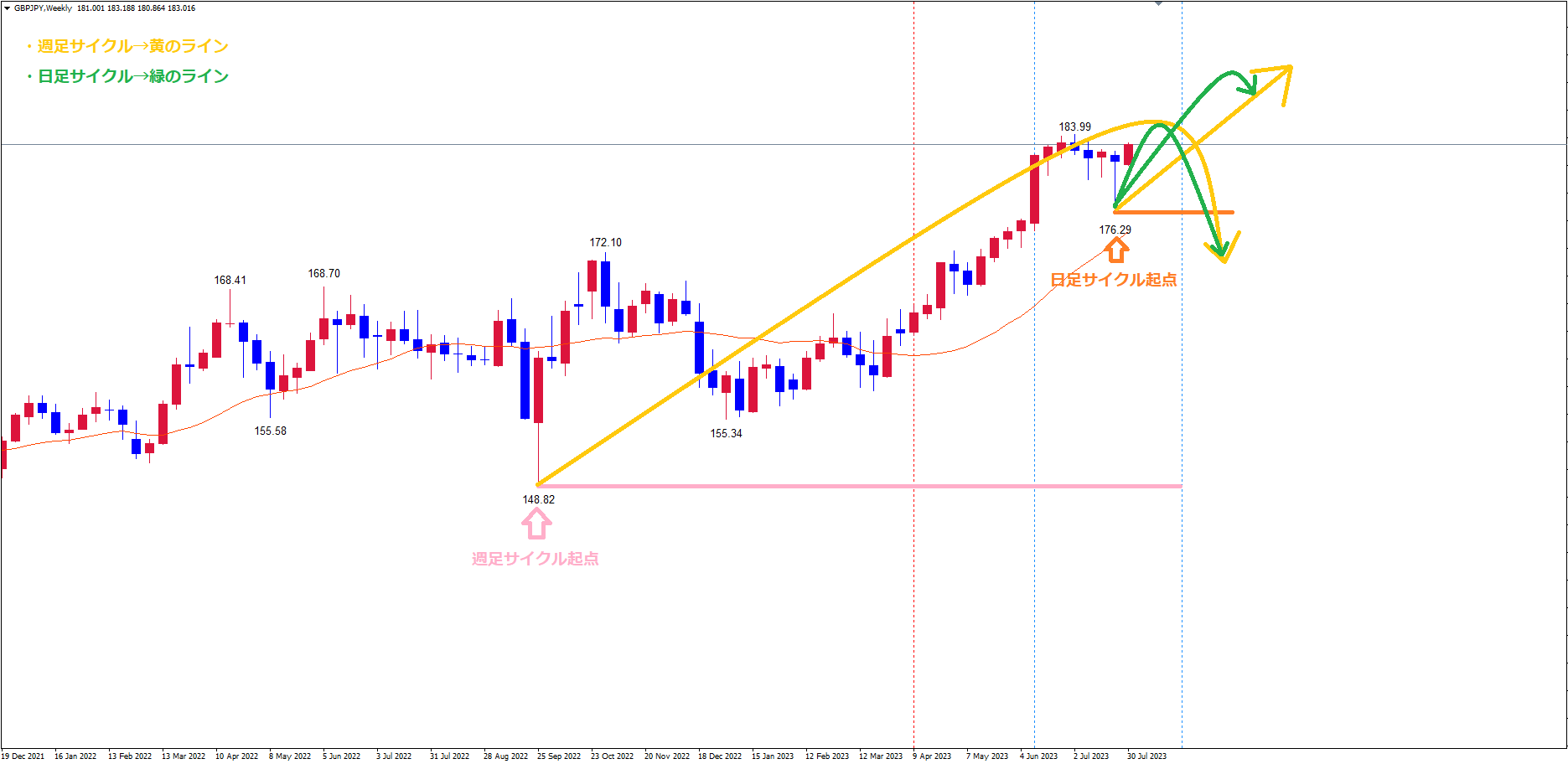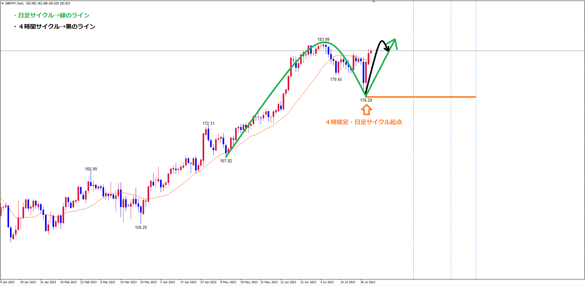 日足サイクルは、起点オレンジのライン(7/28の安値176.29)から現在3本目です。