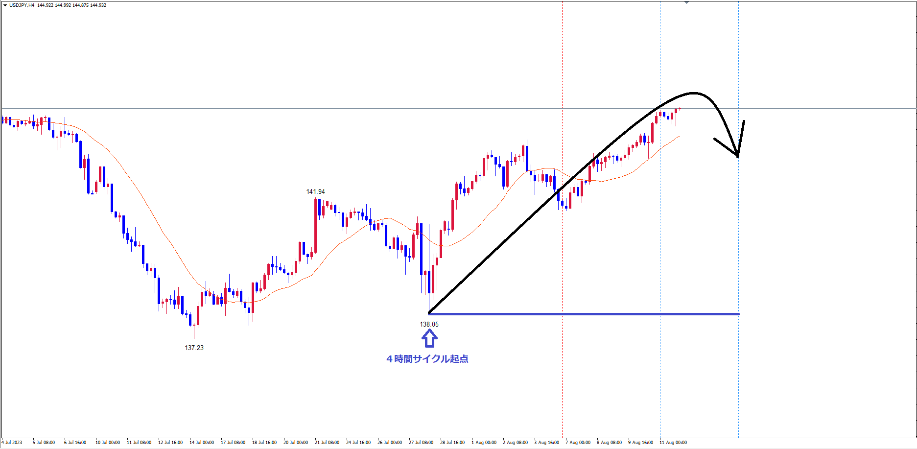 ・ドル円の4時間サイクルは、起点の青のライン(7/28の安値138.05)から、現在65本目です。