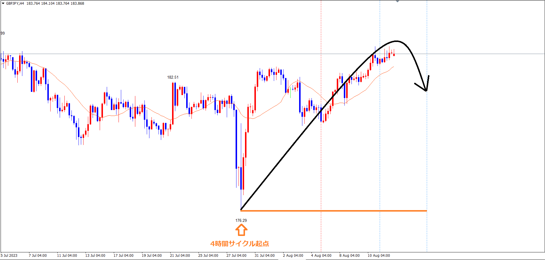 ポンド円の4時間サイクルは、起点のオレンジのライン(7/28の安値176.29)から、現在66本目です。