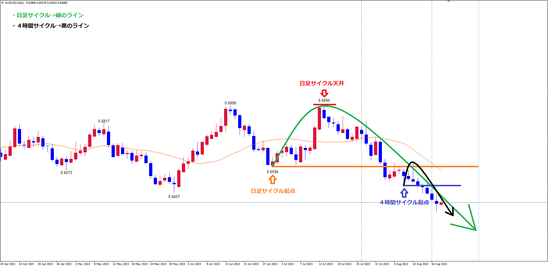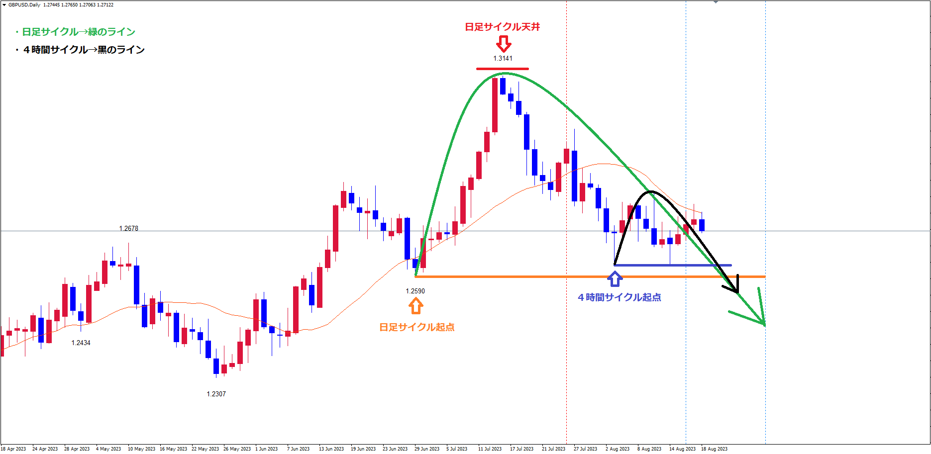 日足サイクルは現在、底へ向けて下落の波、方向感:下方向 という認識です。