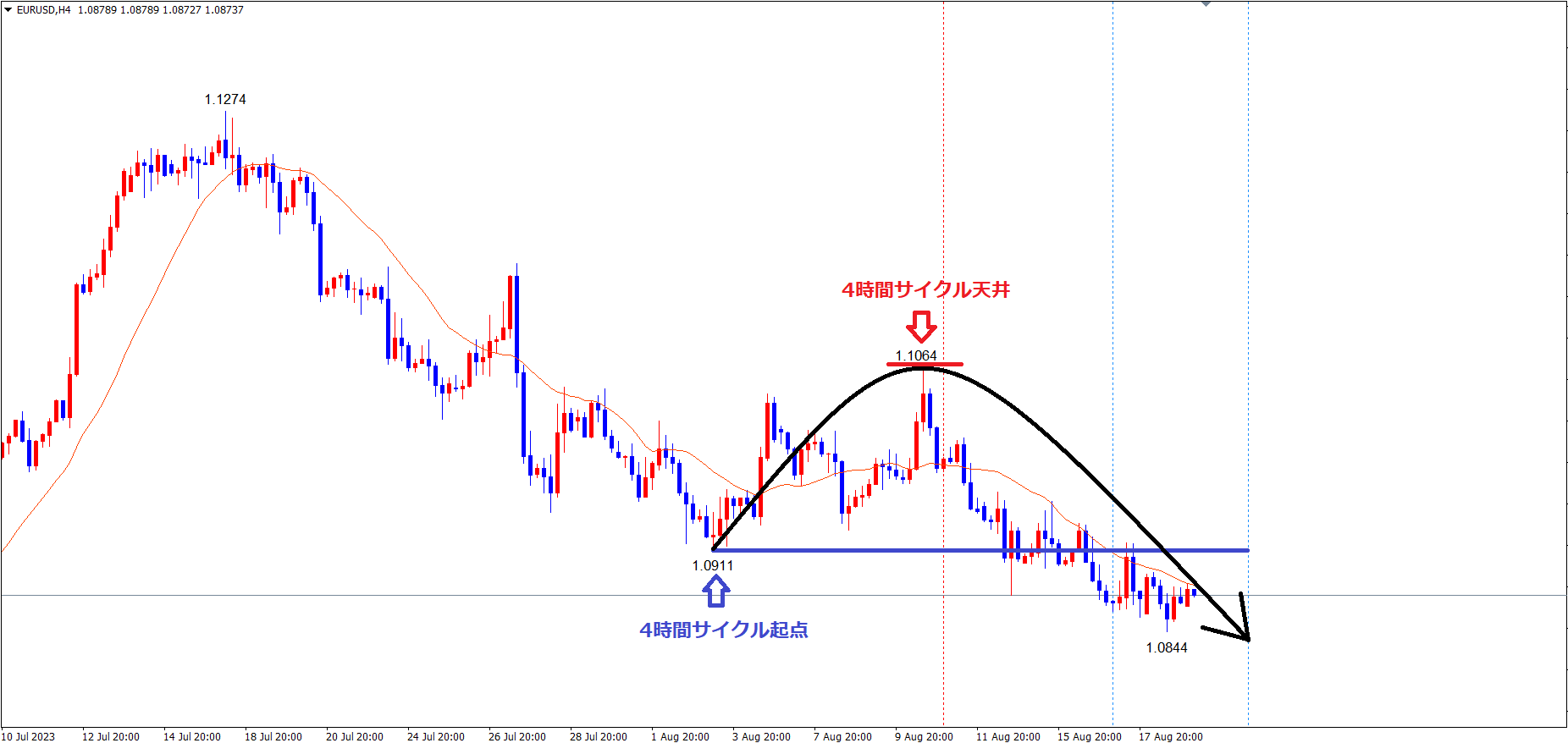 このサイクルは、天井赤のライン(8/10の高値1.1064)を中央より左側で付けている事で、