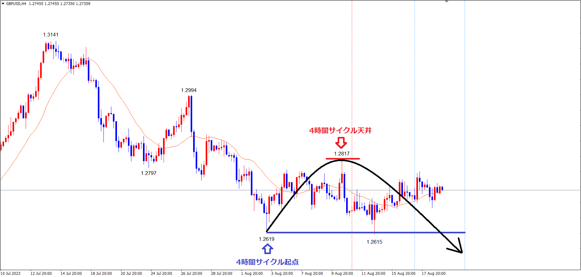 イレギュラーで、直近のサイクル内最安値(8/14の安値1.2615)で底を付けて反転しているサイクルを考えていきます。
