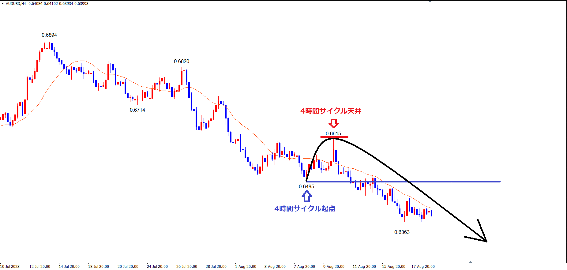 豪ドルドル4時間サイクルは、起点の青のライン(8/8の安値0.6495)から現在52本目です。