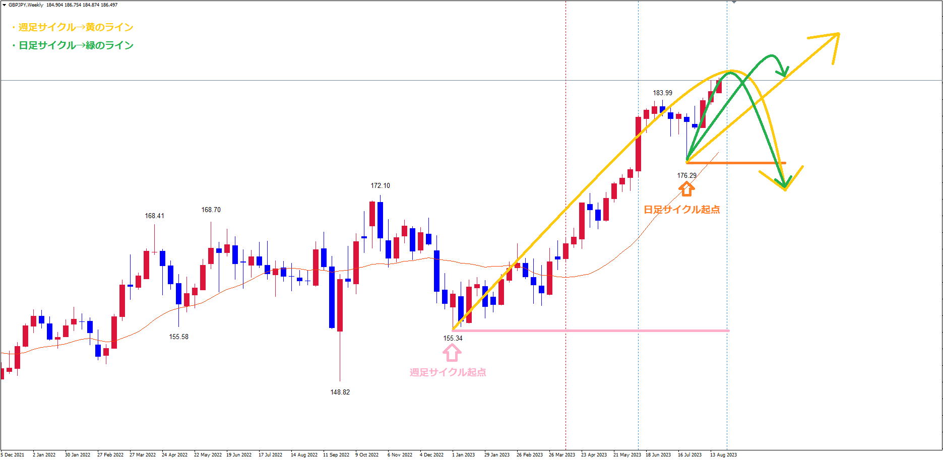 今回はポンド円の日足・週足のサイクル的認識とパターン&イメージがどうなるかについて解説していきます。