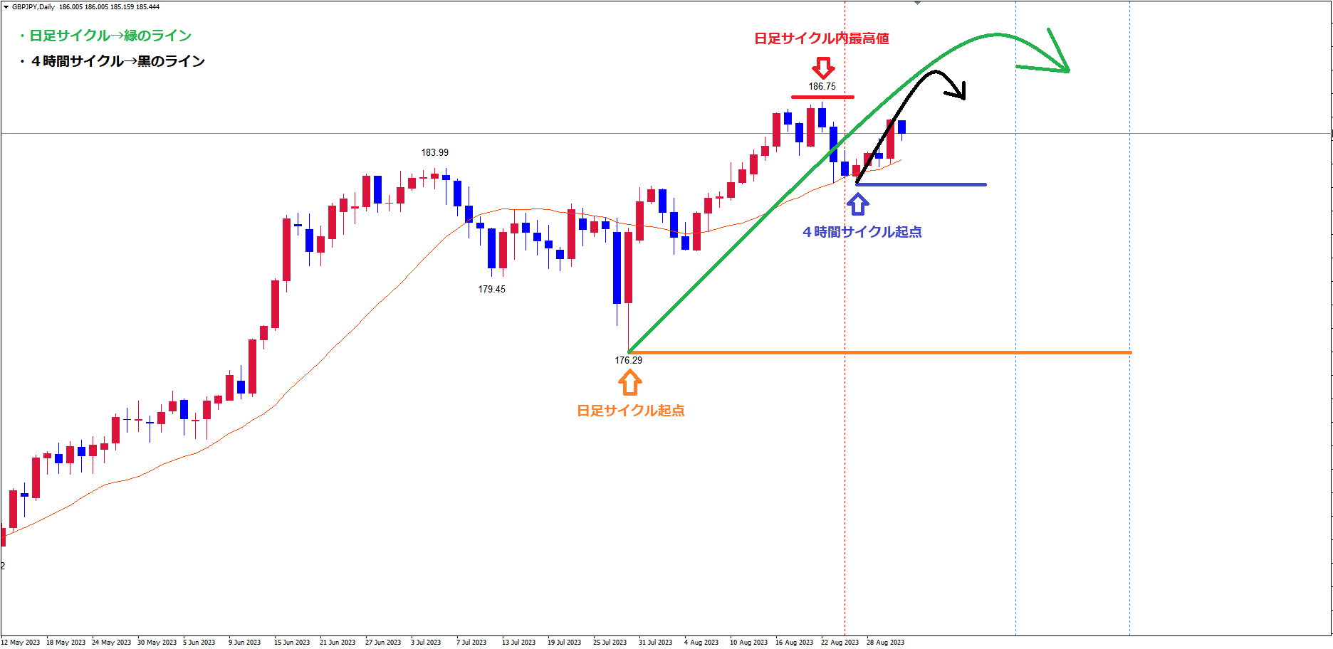 日足サイクルは、起点オレンジのライン(7/28の安値176.29)から現在25本目です。