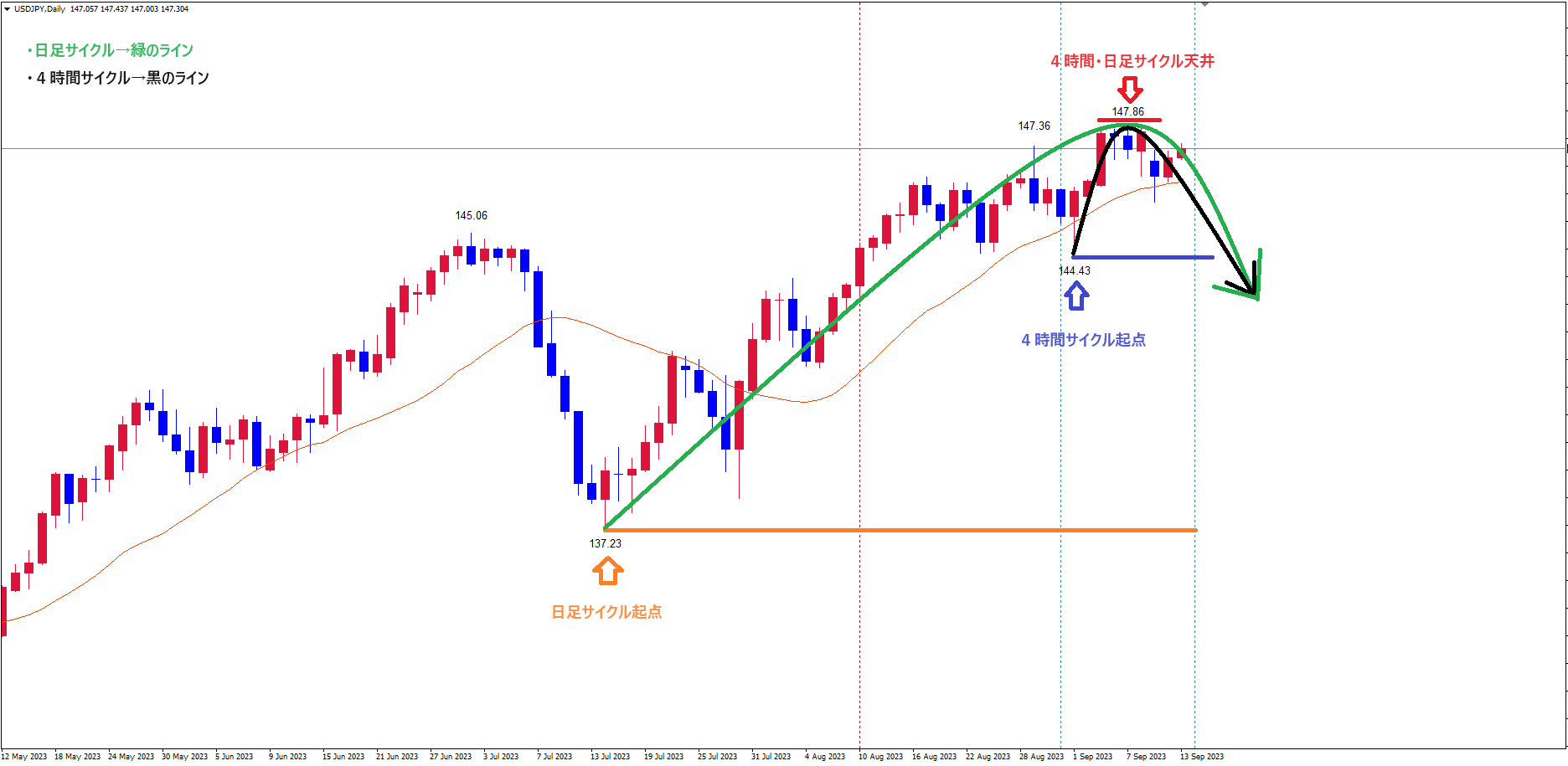 このサイクルは、赤のライン(9/7の高値147.86)で天井を付け、底へ向けて下落の波、方向感:下方向 という認識です。