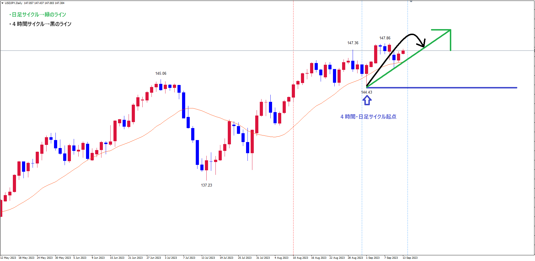 ドル円の日足サイクルは、36本目に付けた最安値青のライン(9/1の安値144.43)で底を付けていてもおかしくない状況です。