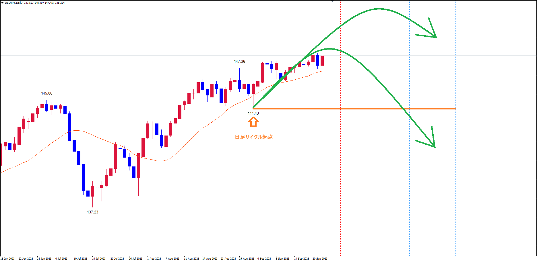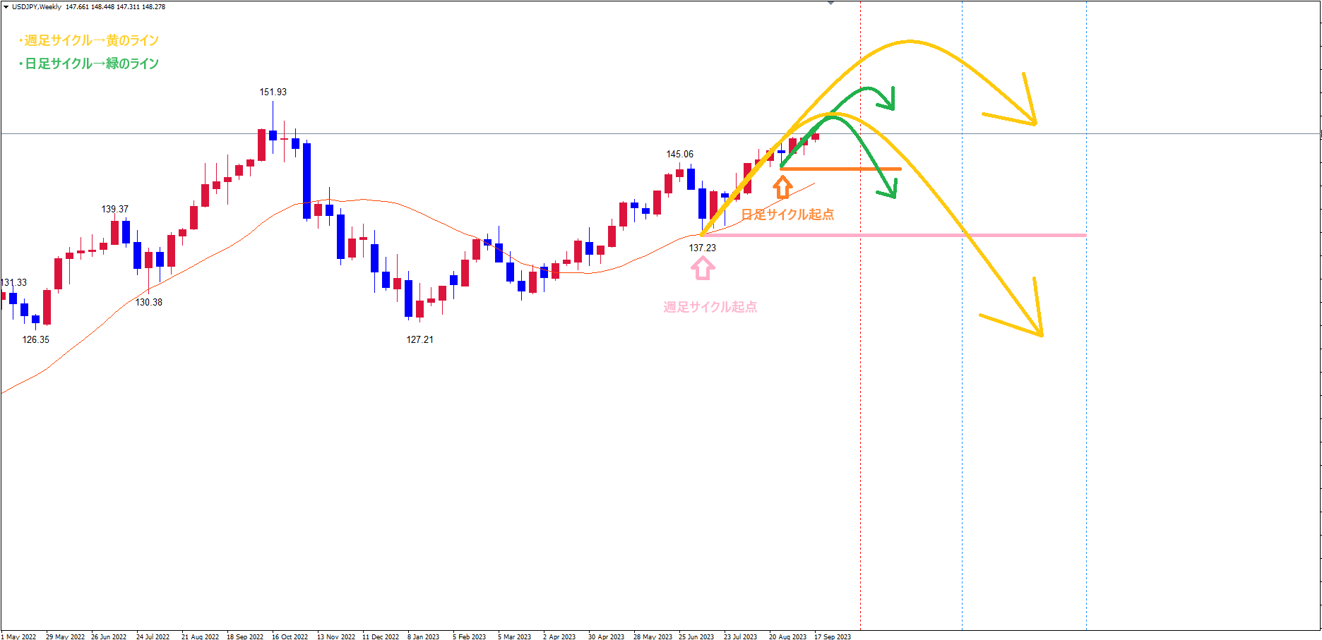 起点オレンジのライン(9/1の安値144.43)からのサイクルは、現在16本目です。