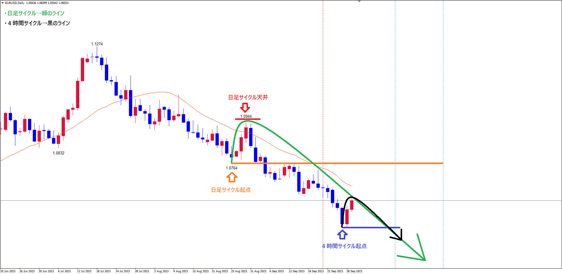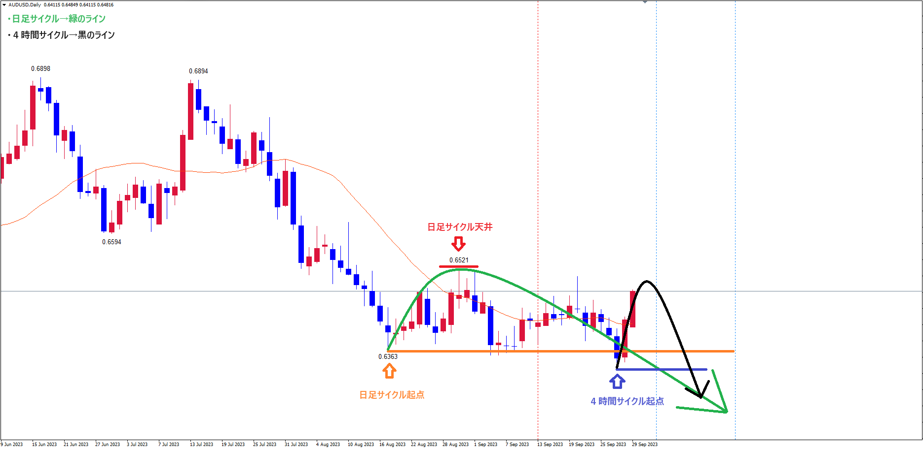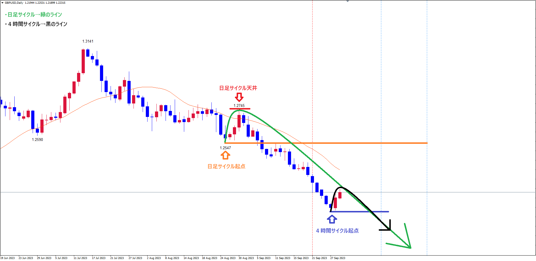 既に起点オレンジのラインを割れる下落をしているので、日足サイクルは理論的にレフトトランスレーションのサイクルという事が確定しています。