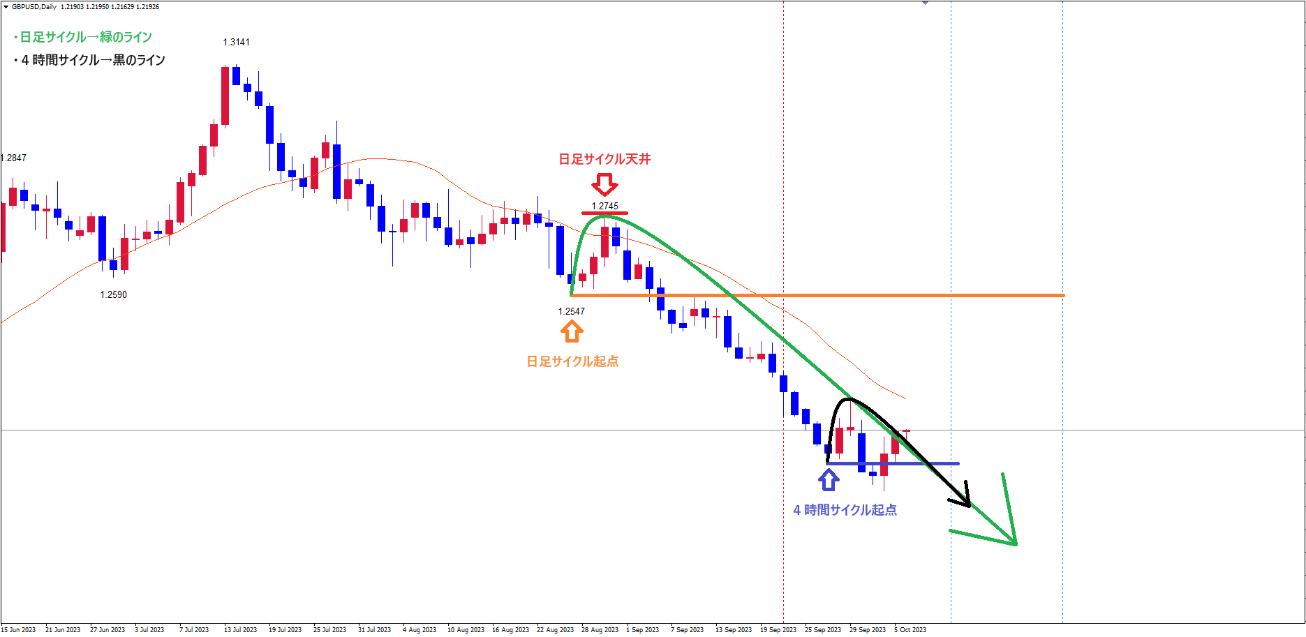 既に起点オレンジのラインを割れる下落をしているので、日足サイクルは理論的にレフトトランスレーションのサイクルという事が確定しています。