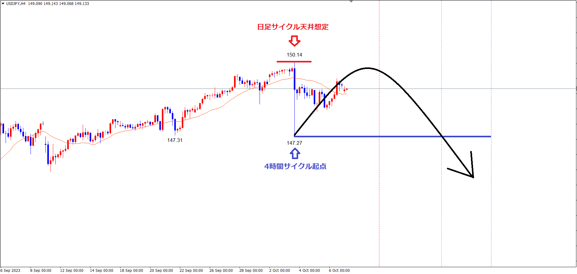日足サイクルは、赤のライン(10/3の高値150.14)で天井を付け、底へ向けて下落の波、方向感:下方向 という認識です。