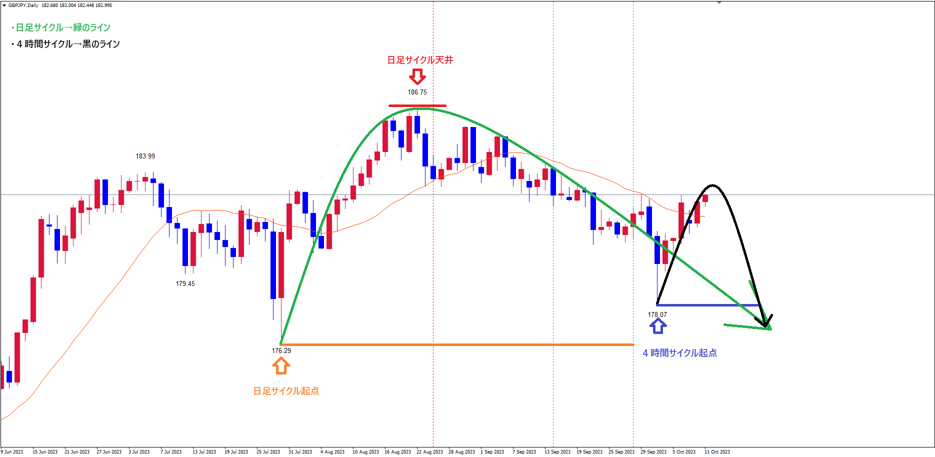 日足サイクルの本数的状況を考えると、既に青のライン(10/3の安値178.07)で底を付けている可能性が高くなっているので、