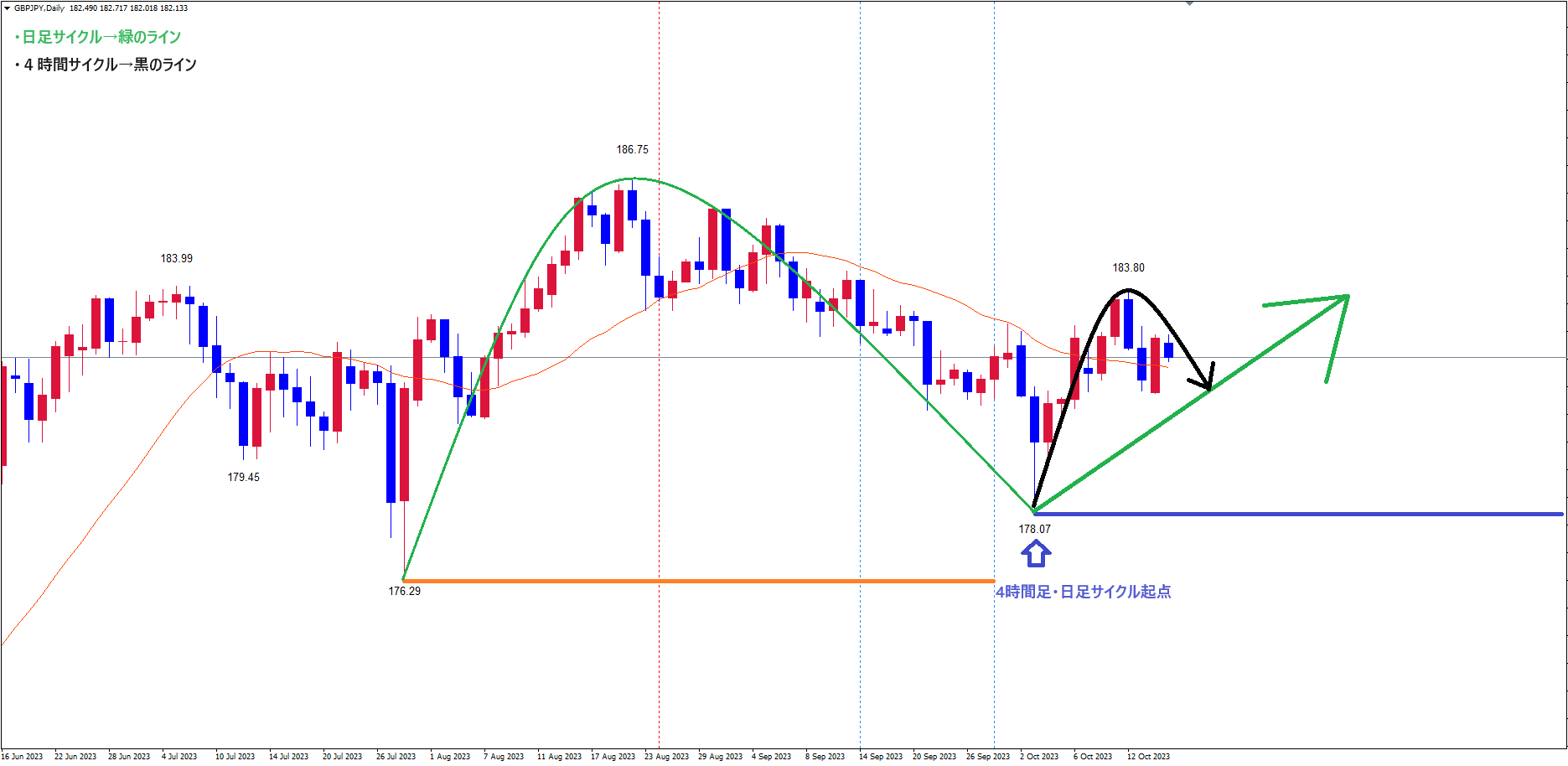 日足サイクルは、起点青のライン(10/3の安値178.07)から現在11本目です。