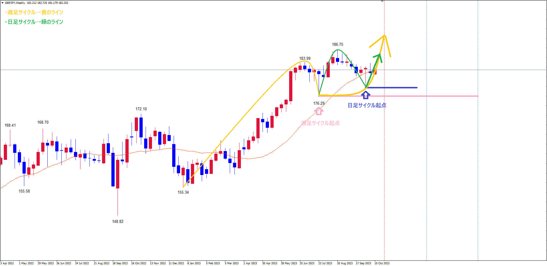 今回はポンド円の日足・週足のサイクル的認識とパターン&イメージがどうなるかについて解説していきます。
