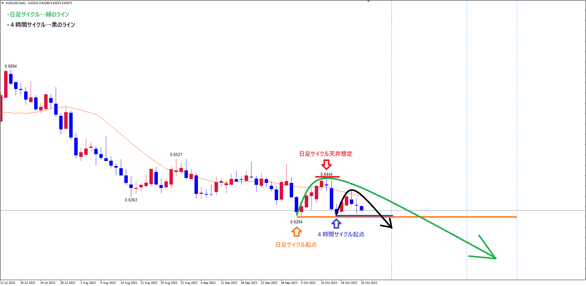 豪ドルドルの日足サイクルも直近のサイクル内最高値赤のライン(10/12の高値0.6444)で天井を付け、