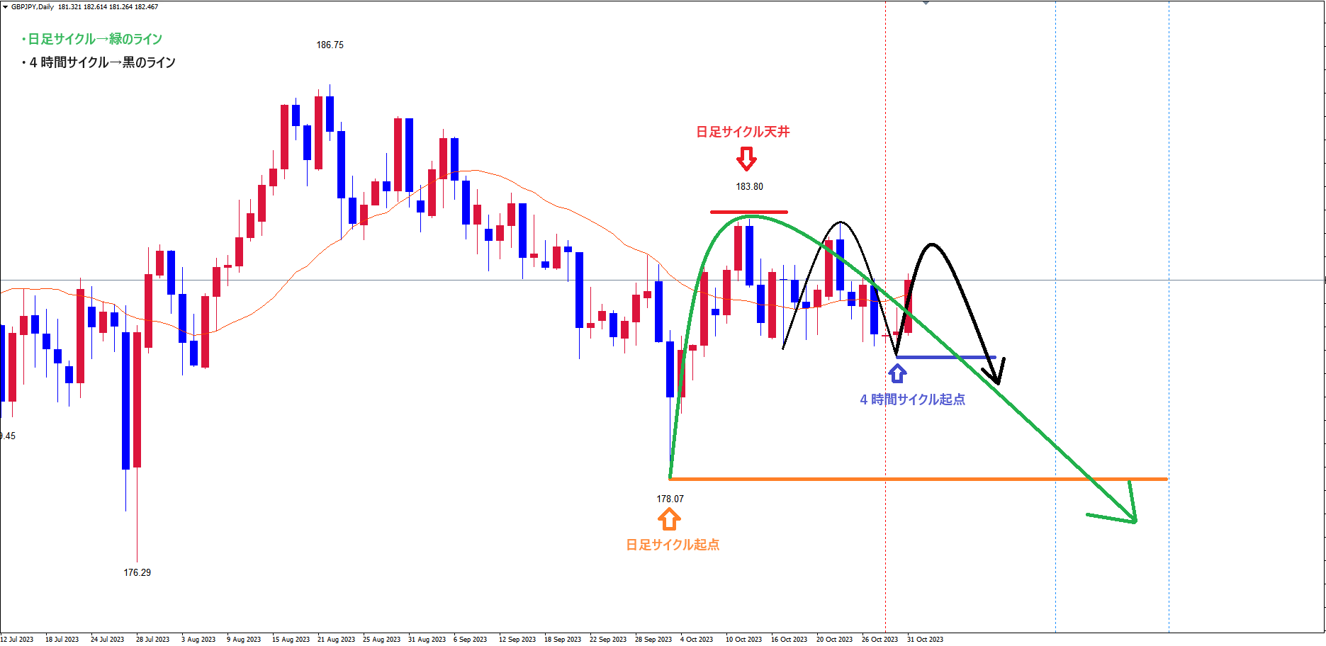 日足サイクルは赤のライン(10/12の高値183.80)で天井を付けて、底へ向けて下落の波、方向感:下方向 に切り替わっていると見ています。