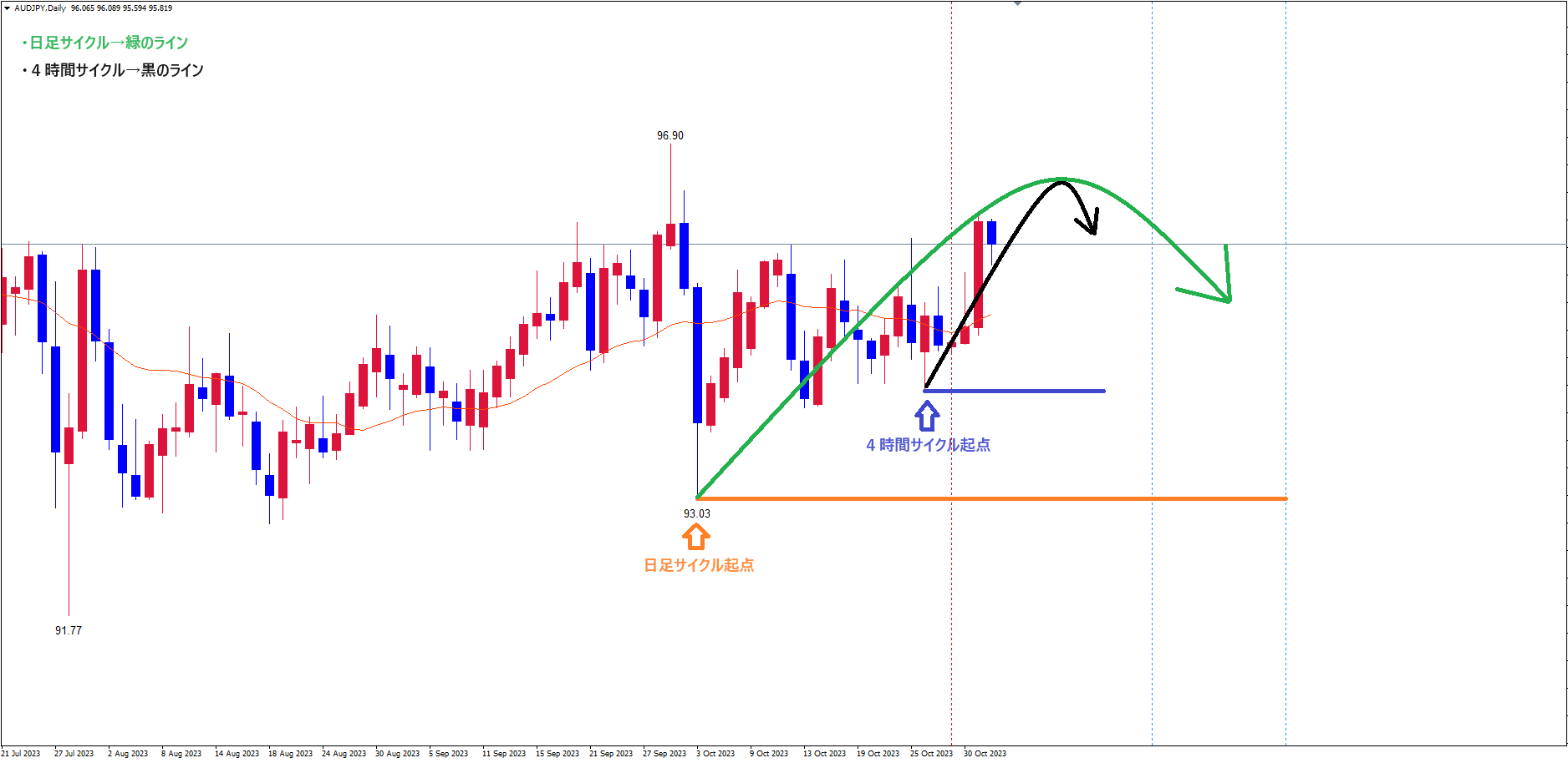 豪ドル円4時間サイクルは、起点の青のライン(10/26の安値94.23)から、現在27本目です。