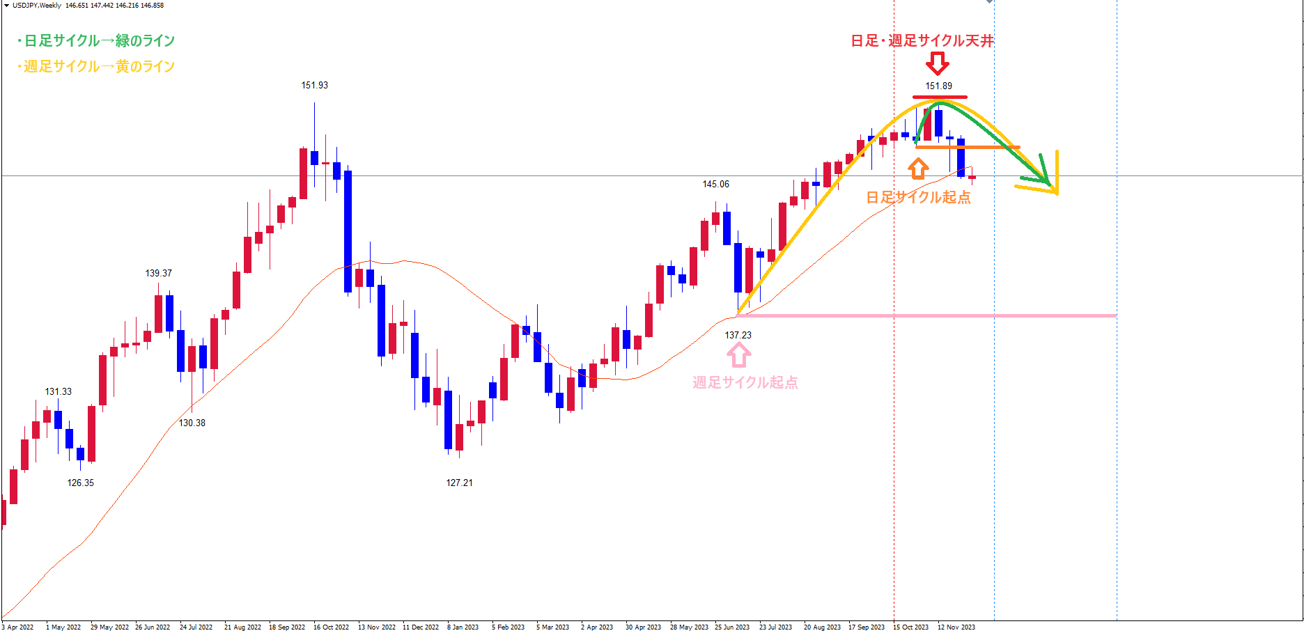 週足サイクルは、起点桃のライン(7/14の安値137.23)から、現在22本目です。